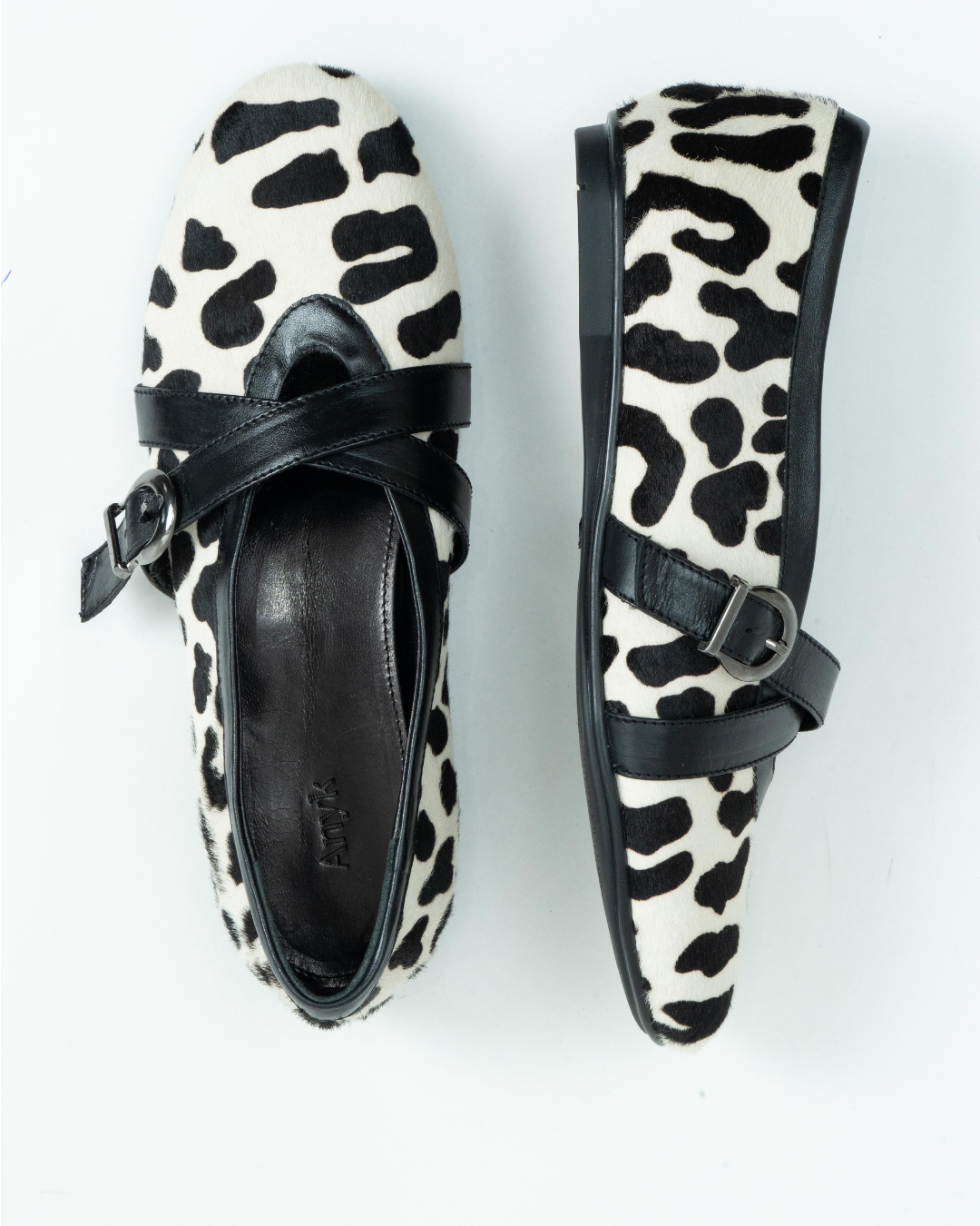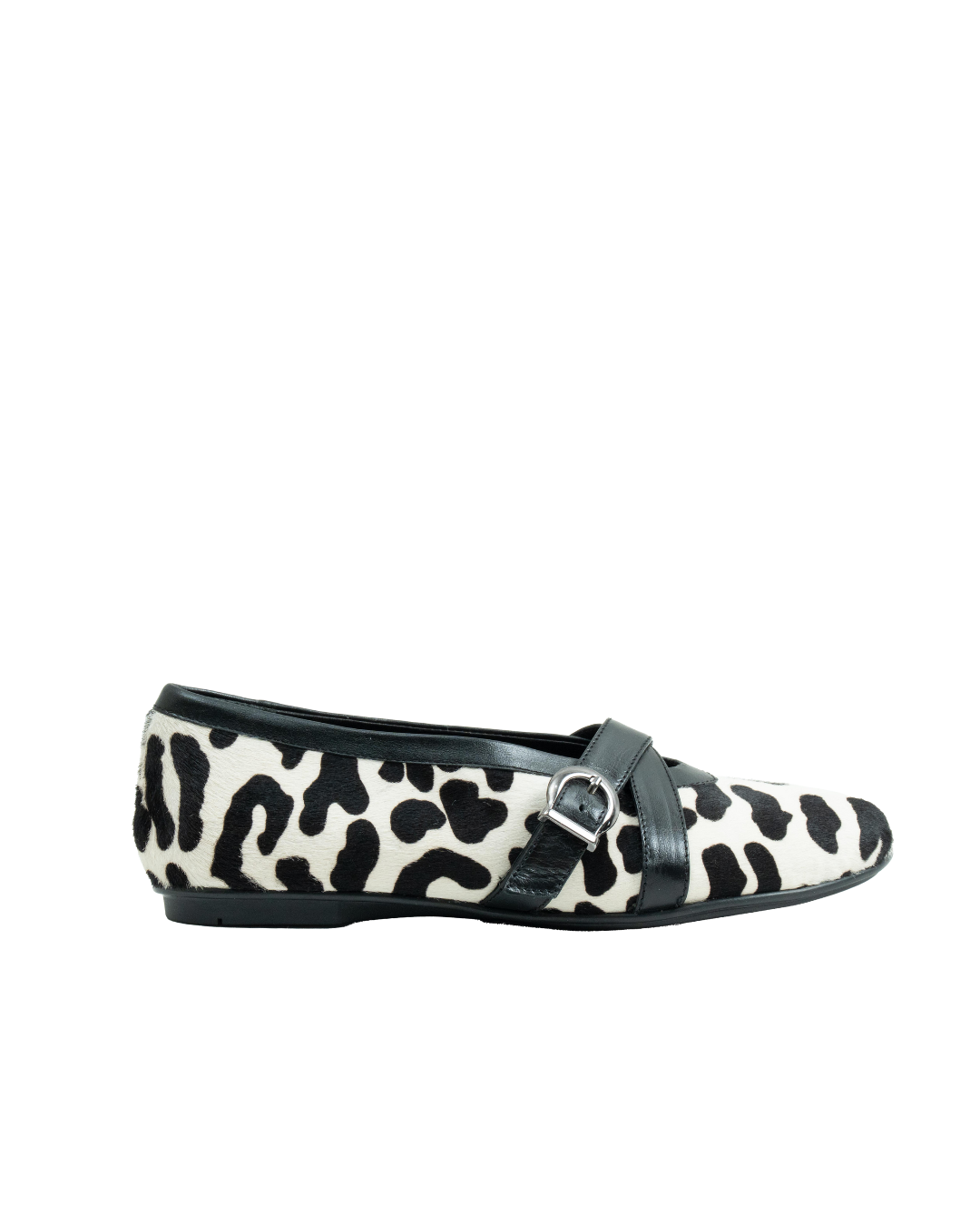 Ballet flats inspired by traditional Japanese footwear. Featuring buckles on top, round toes, and a rubber sole. Flats made from animal-print leather.