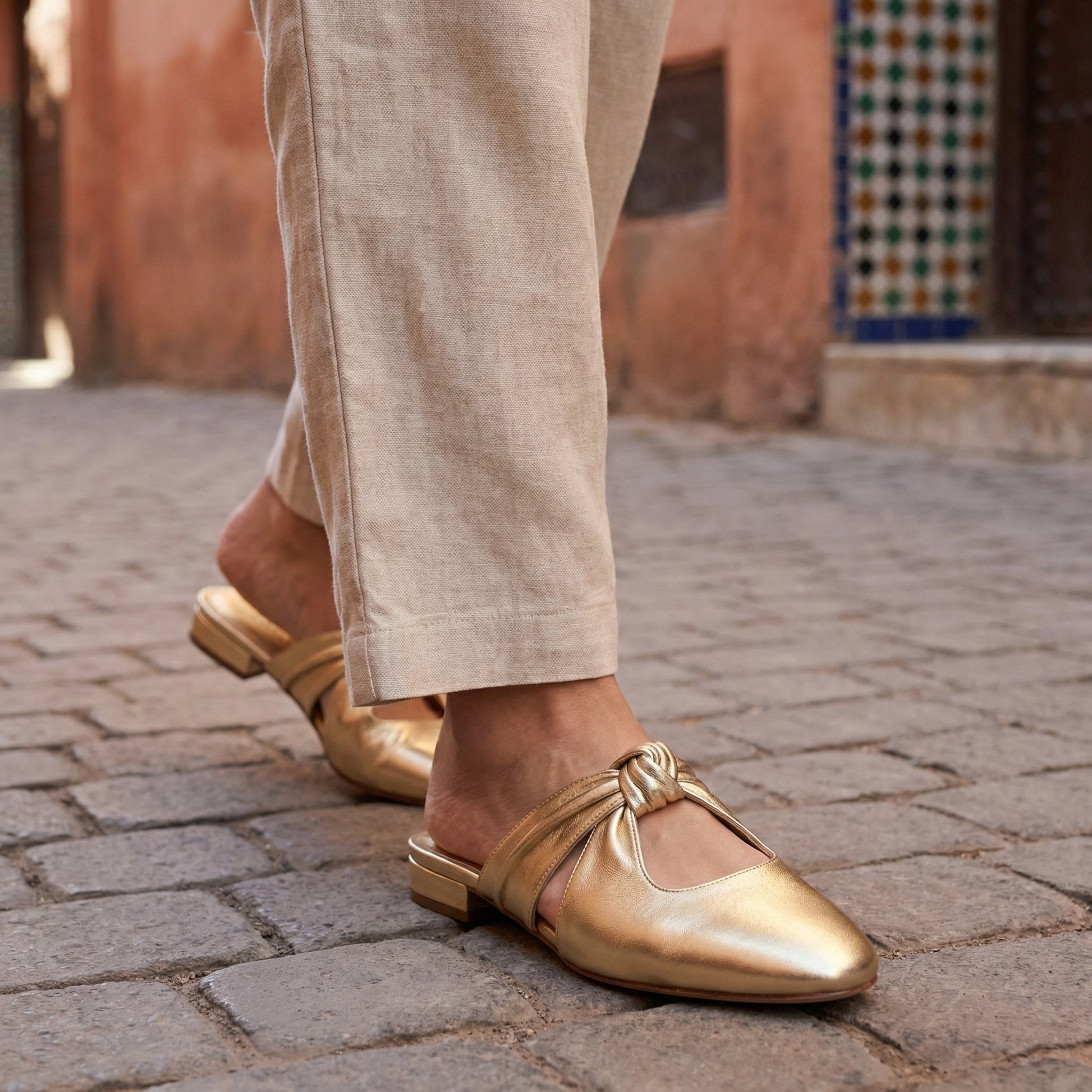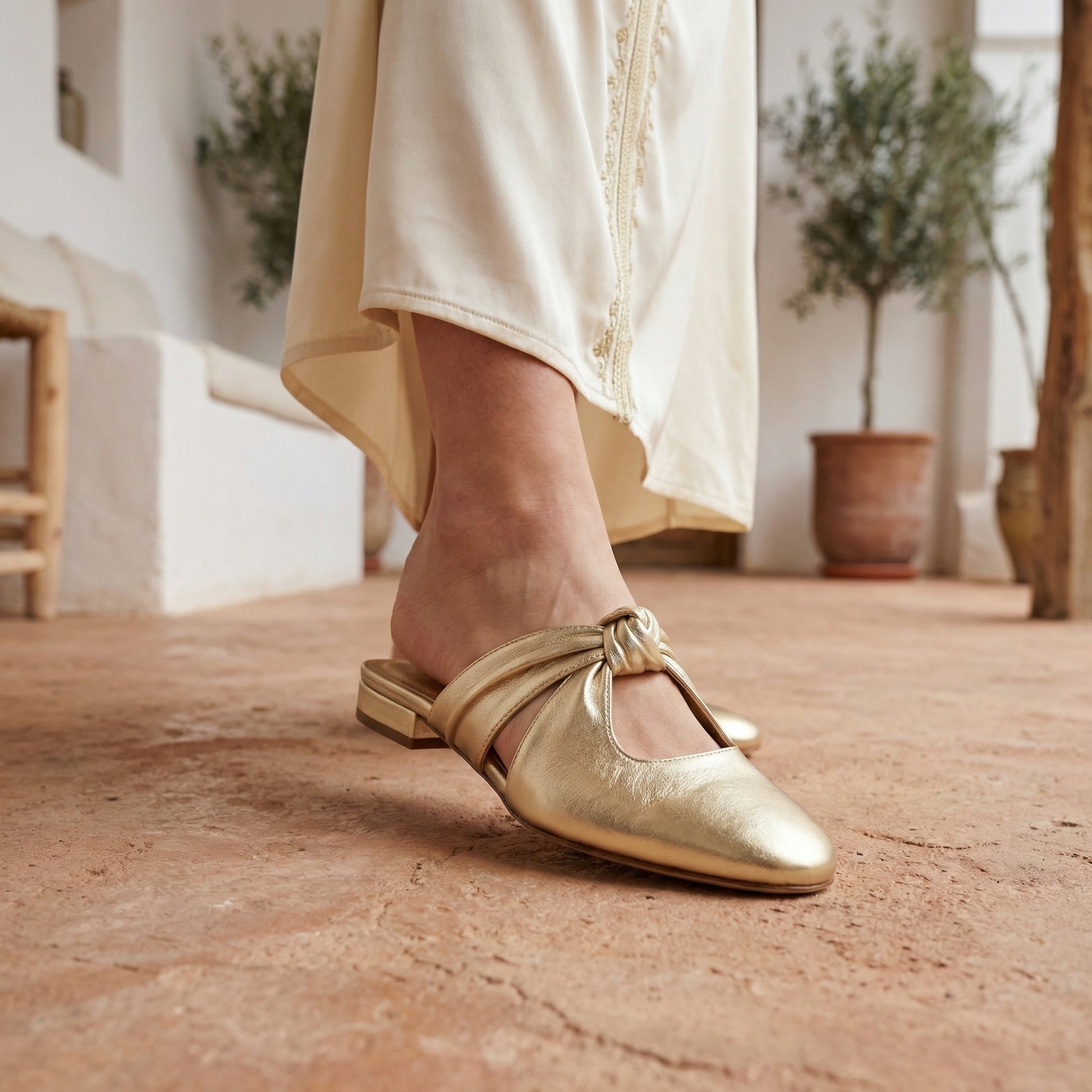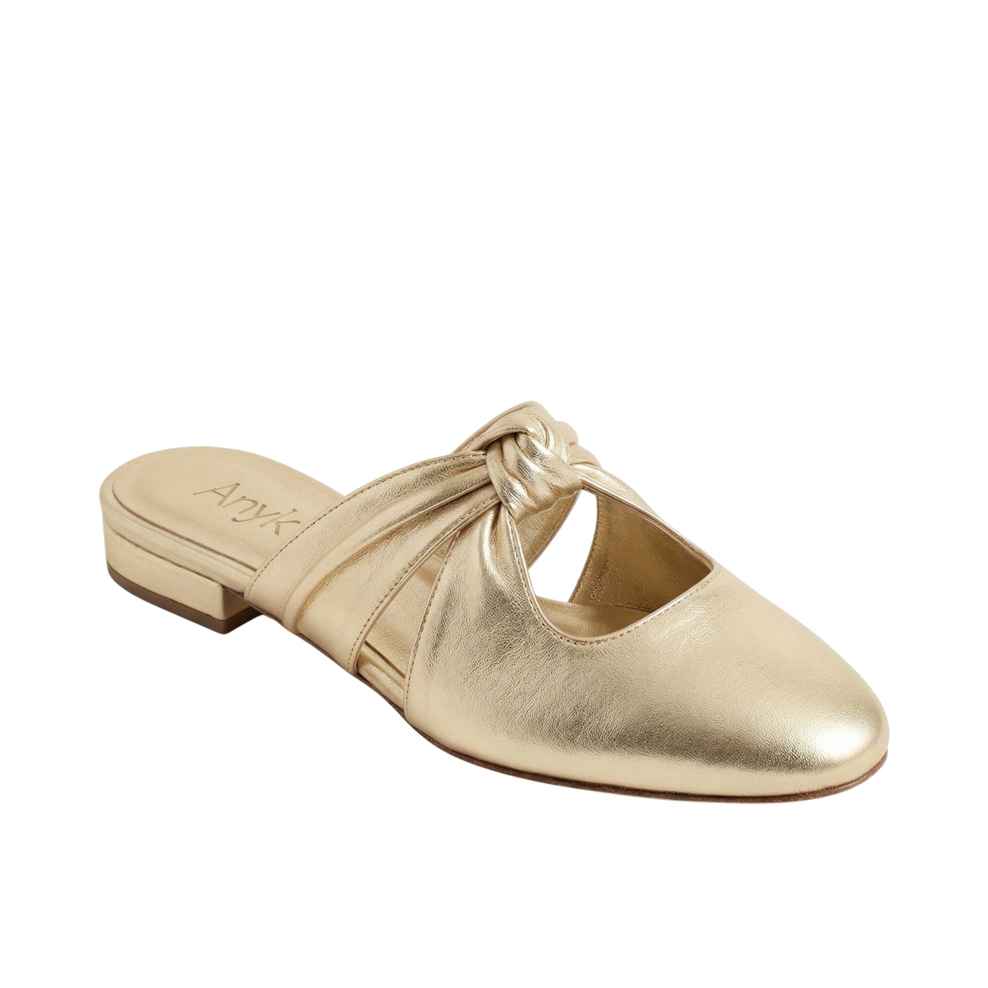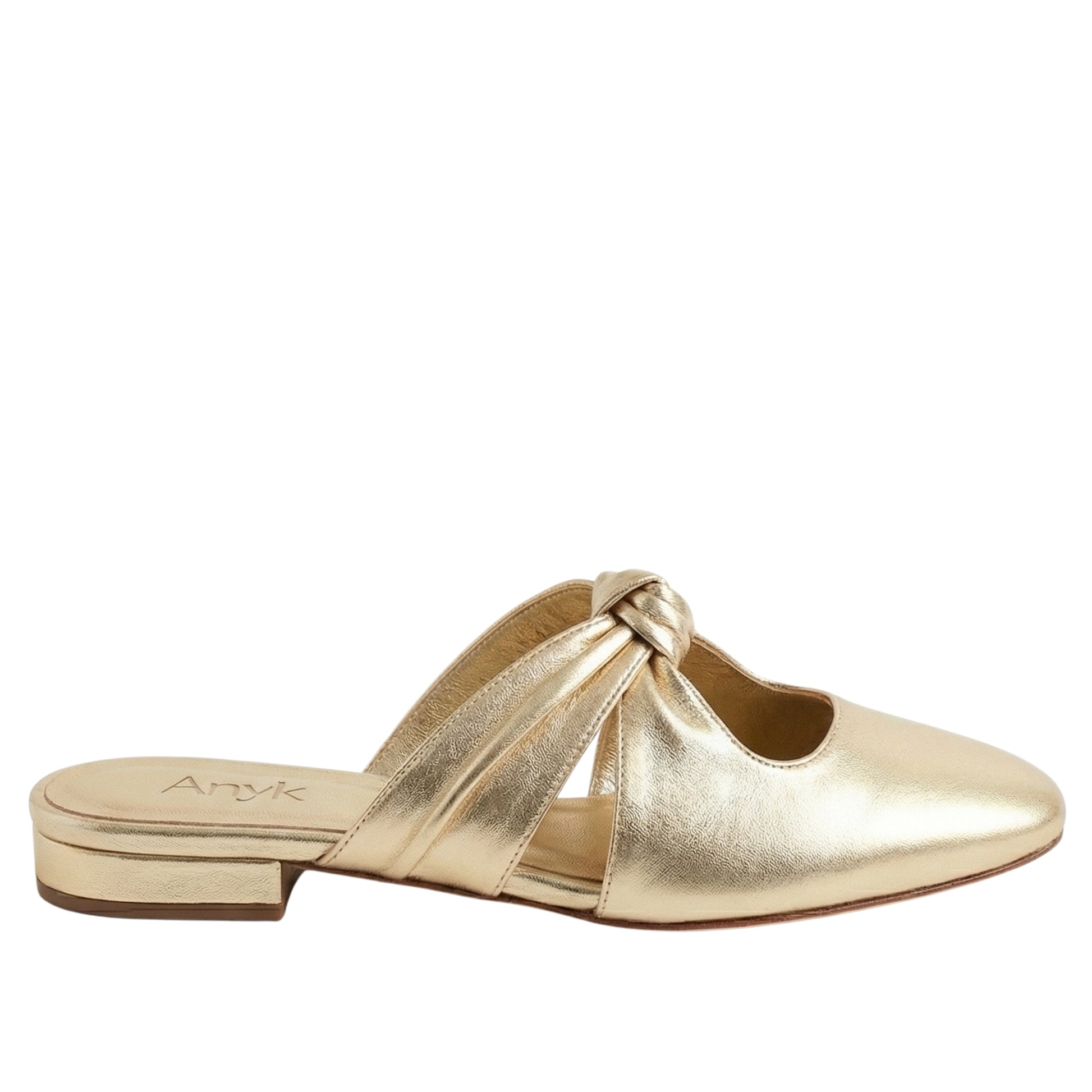 The NODO mule reinterprets a classic flat silhouette through a sculptural knotted upper and a softly rounded closed toe. Crafted in metallic leather, its refined cut and subtle opening create an elegant line that enhances the foot with a modern, feminine feel.